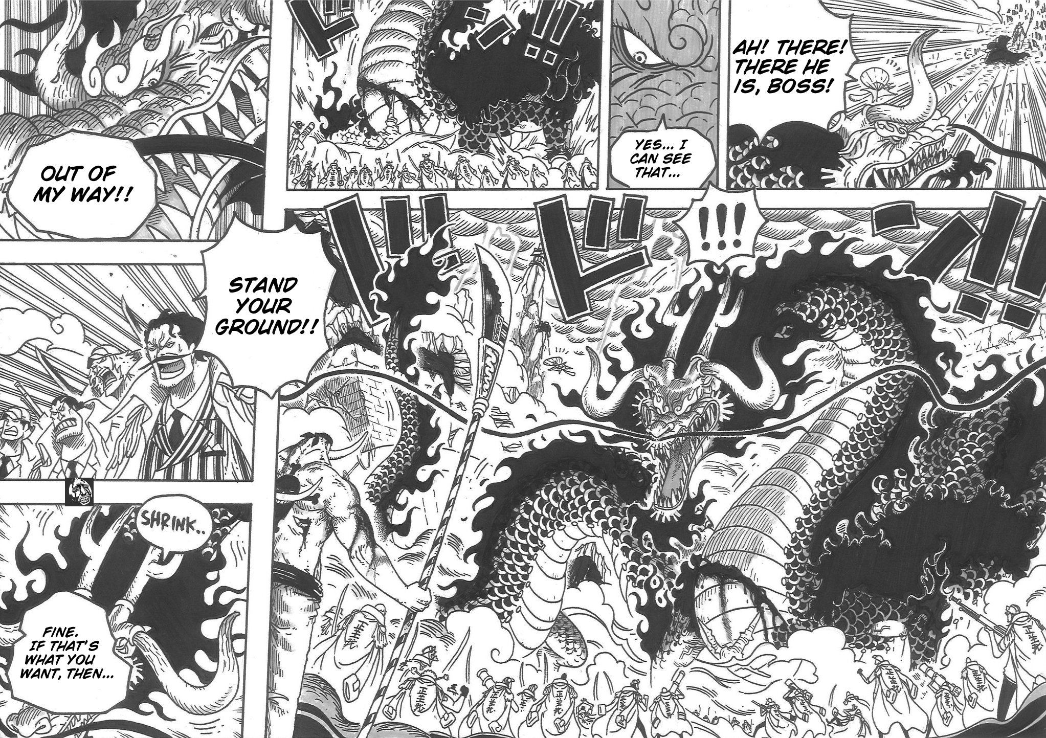 The marines loudly exclaim the presence of the red hair pirates, as they wonder how shanks was able to arrive at marineford so quickly, having fought with kaido the day before.